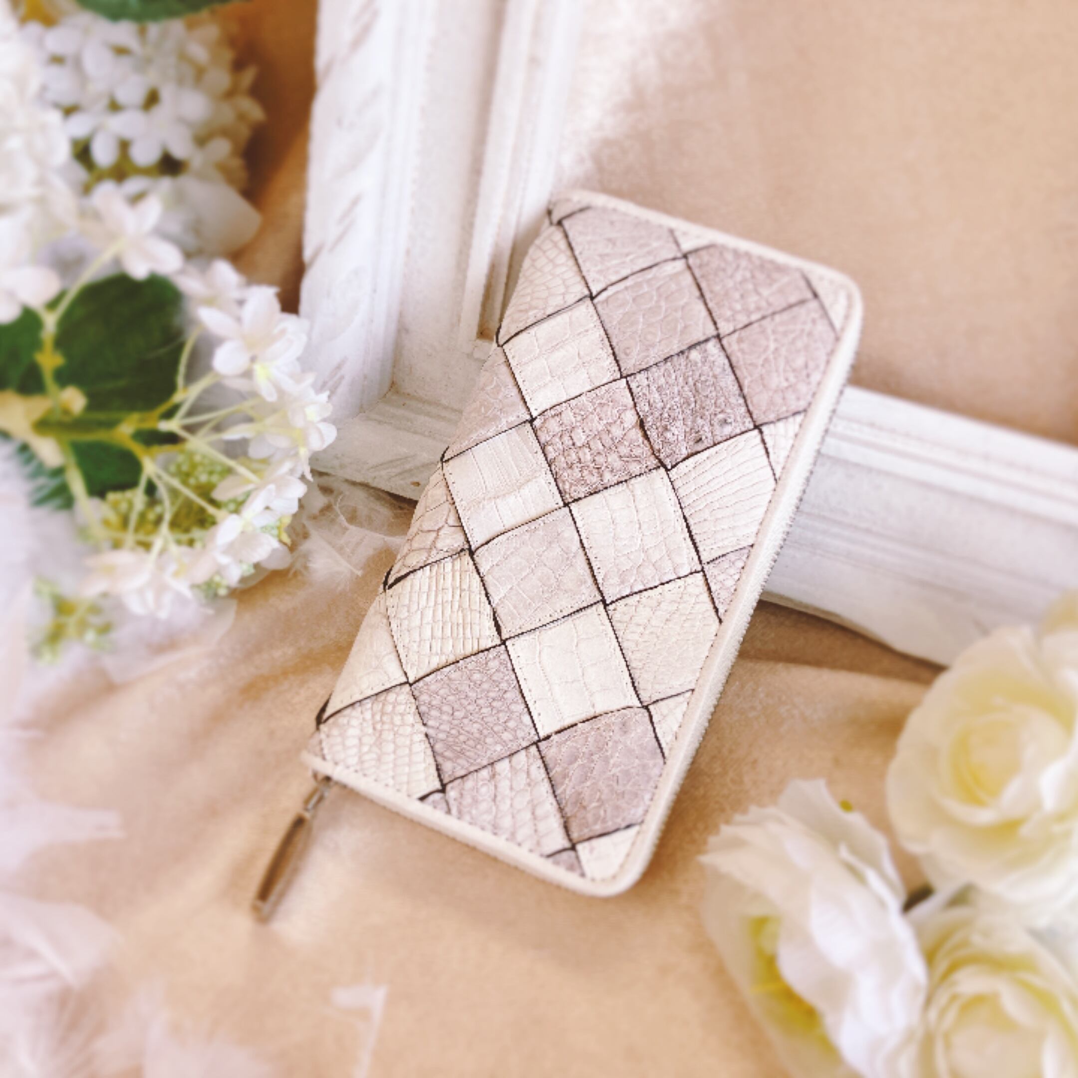 この財布は高級なクロコダイルの革を使用していて、革を大胆に太めに裁断し、丁寧に編み込んで仕立てたメッシュデザインの長財布です。
